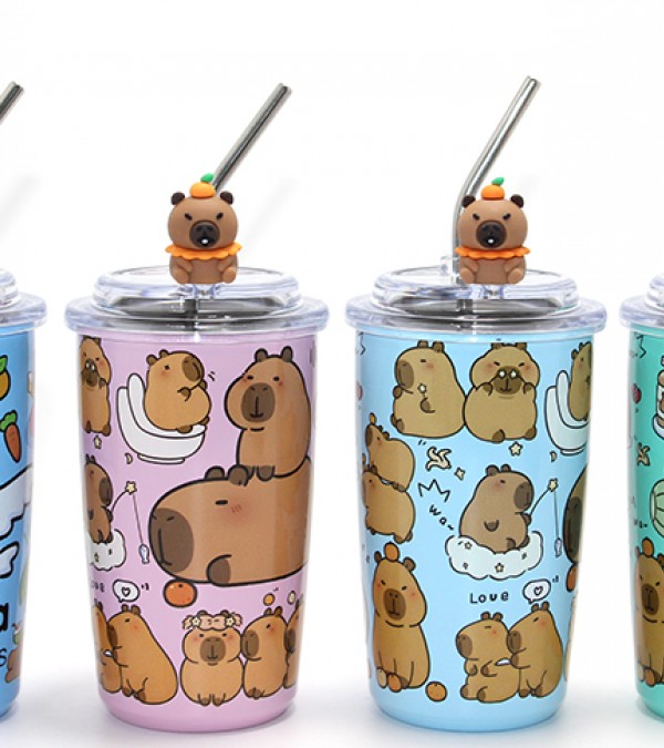 Kapibara Capybara Figürlü Isı Muhafazalı Metal Pipetli Paslanmaz Çelik Kupa Alk4429