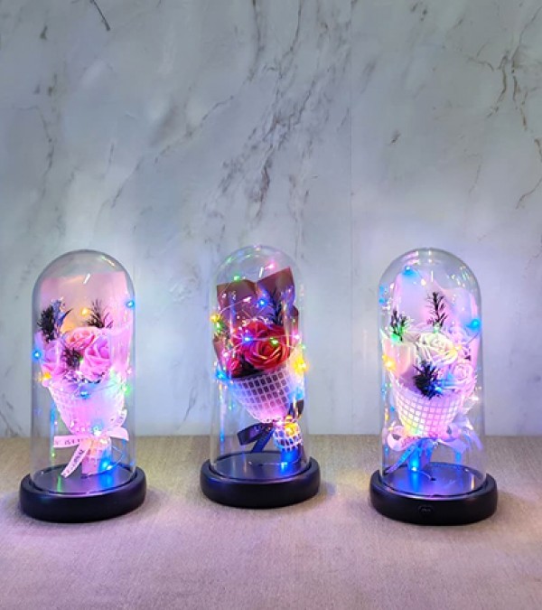 Işıklı Müzikli Fanus içinde Gül Buketi Alk5003
