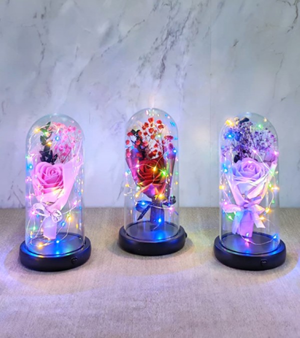 Işıklı Müzkli Dekoratif Cam Fanus İçinde Gül Alk5005